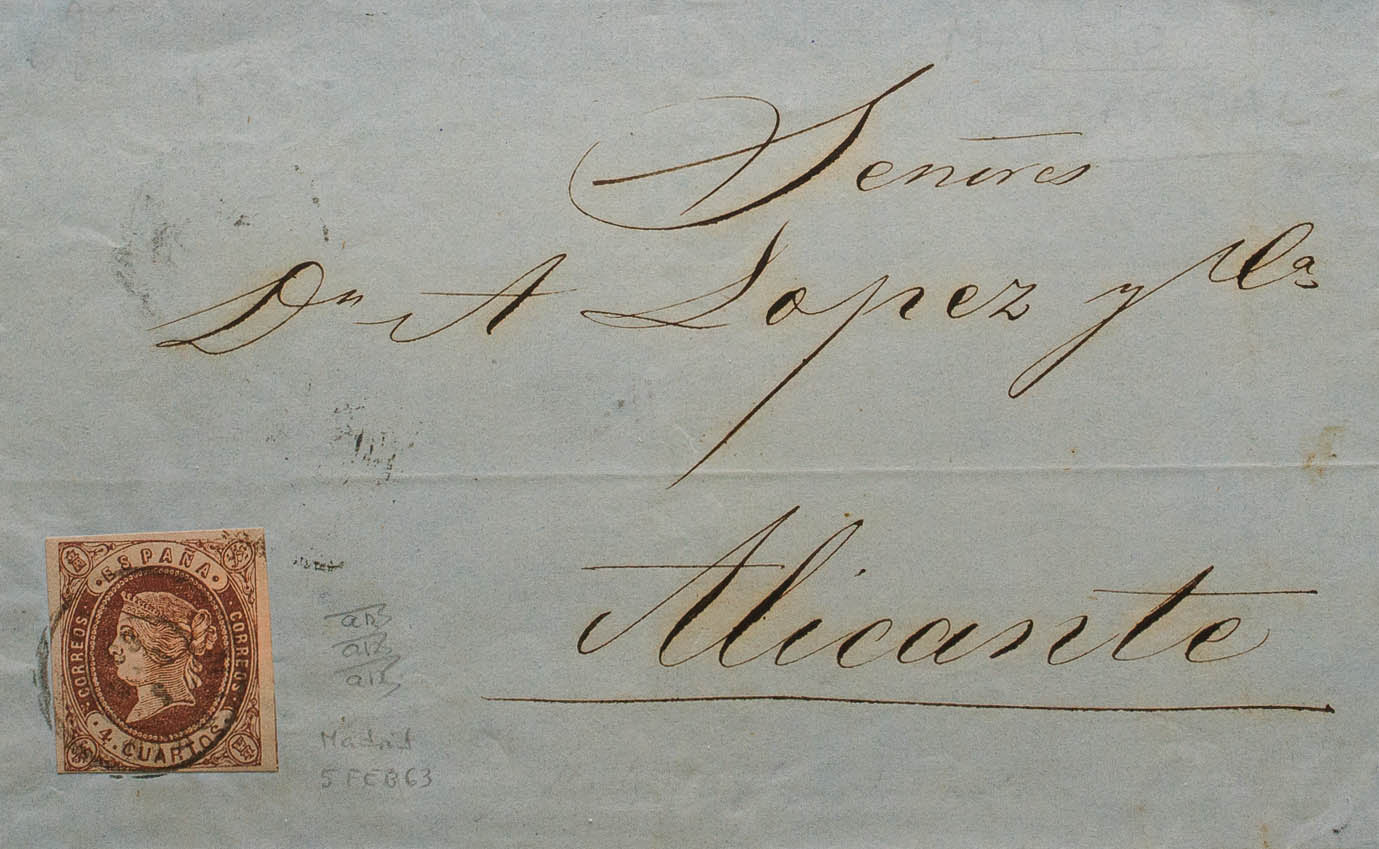 58. 1863. 4 cuartos castaño. MADRID a ALICANTE. Matasello MADRID / (1). MAGNIFICA Y RARISIMA.