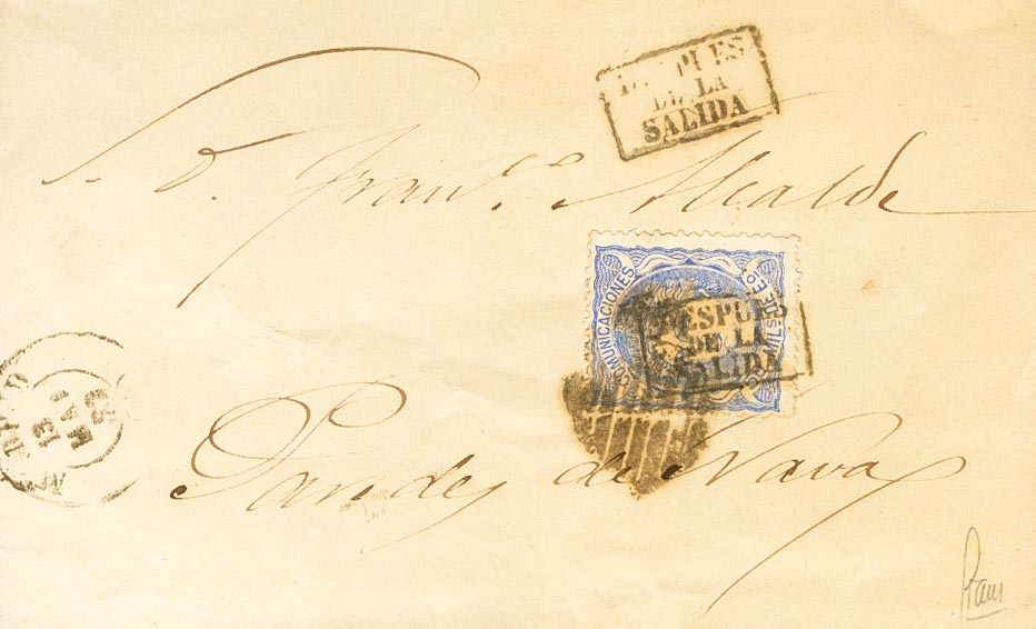107. 1872. 50 mils ultramar. MADRID a PAREDES DE NAVA (PALENCIA). Matasello mixto PARRILLA y marca DESPUES / DE LA / SALIDA, repetida en el frente. MAGNIFICA.