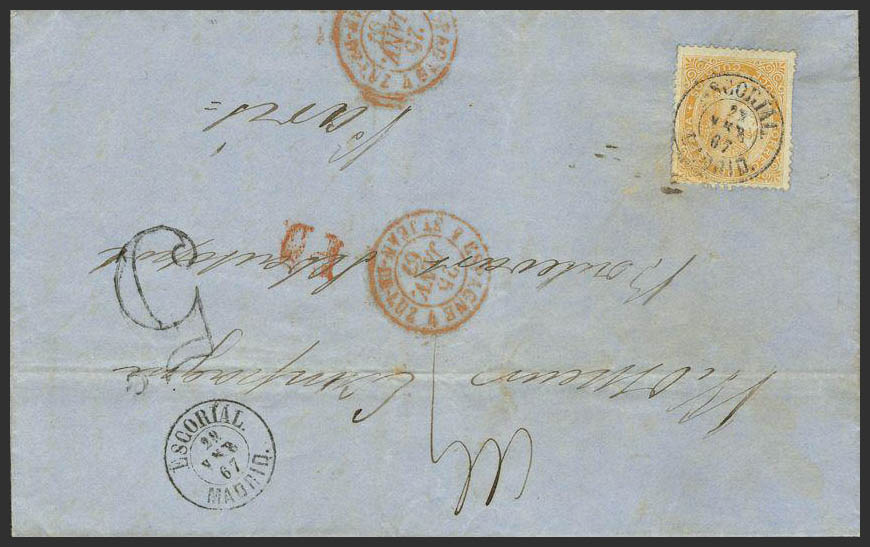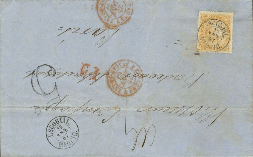89A. 1867. 12 cuartos naranja. EL ESCORIAL a PARIS. Matasello ESCORIAL / MADRID. MAGNIFICA.