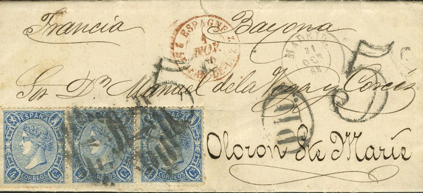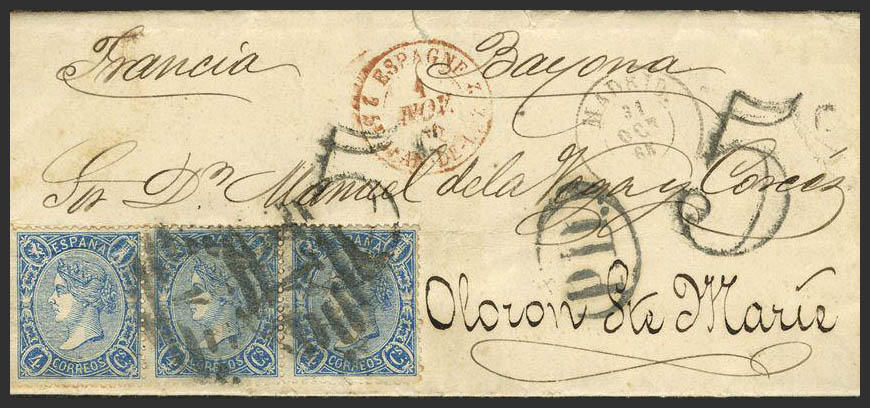 75(3). 1765. 4 cuartos, tres sellos. MADRID a OLORON DE MARIE (FRANCIA). MAGNIFICA E INUSUAL COMBINACION.