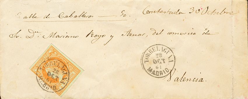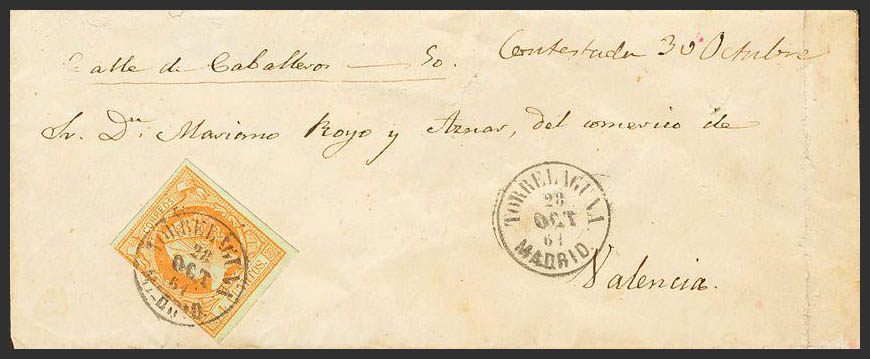 52. 1861. 4 cuartos naranja. TORRELAGUNA a VALENCIA. Matasello TORRELAGUNA / MADRID. MAGNIFICA.