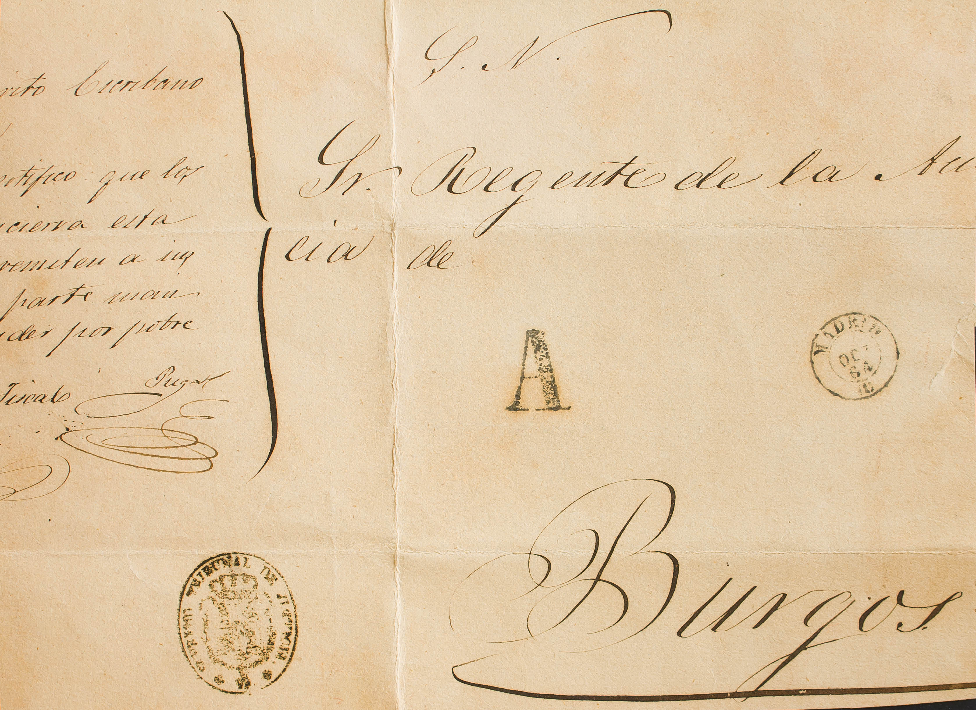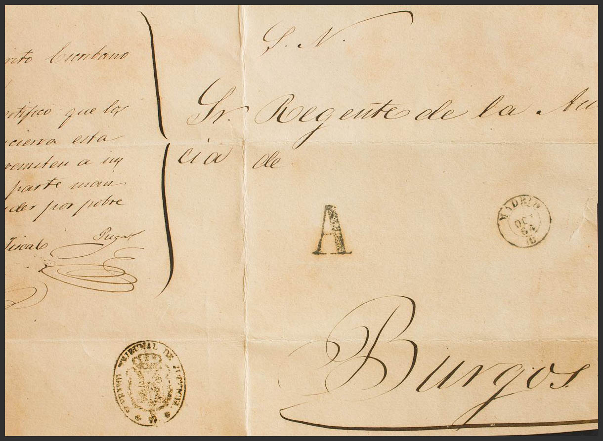 1864. Plica Judicial de MADRID a BURGOS. Marca SUPREMO TRIBUNAL DE JUSTICIA y "A" de Abono, en negro (P.E.88) edición 2004. MAGNIFICO.