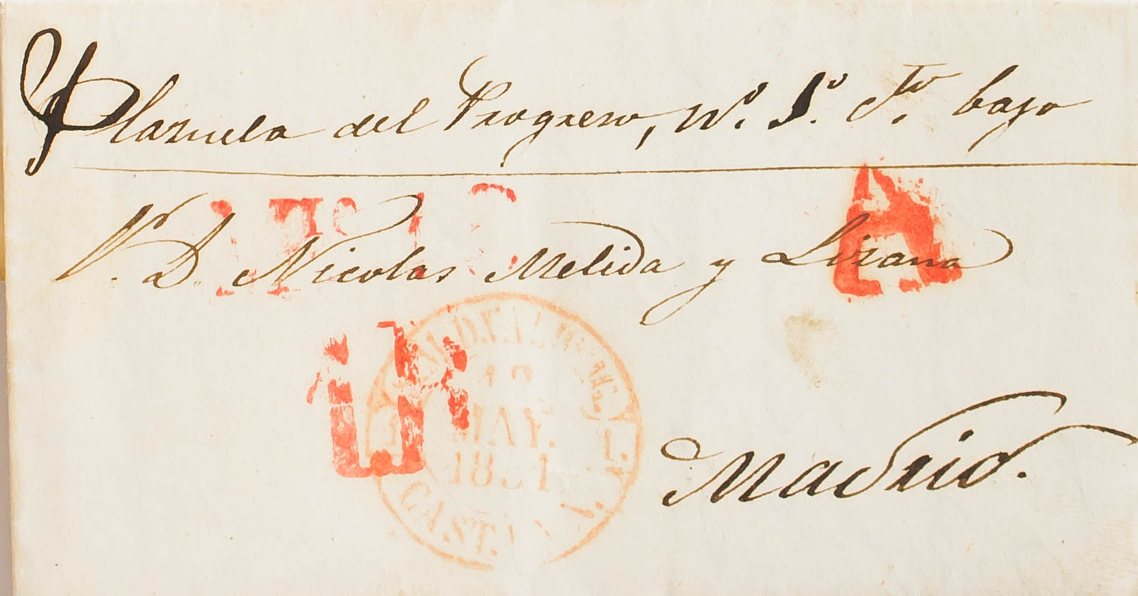 1851. CEBREROS a MADRID. Baeza S.M.D. VALDEIG. / CAST. LA N., en rojo y marca "A", en rojo de Abono y aplicada a la llegada. MAGNIFICA Y MUY RARA COMBINACION DE MARCAS.