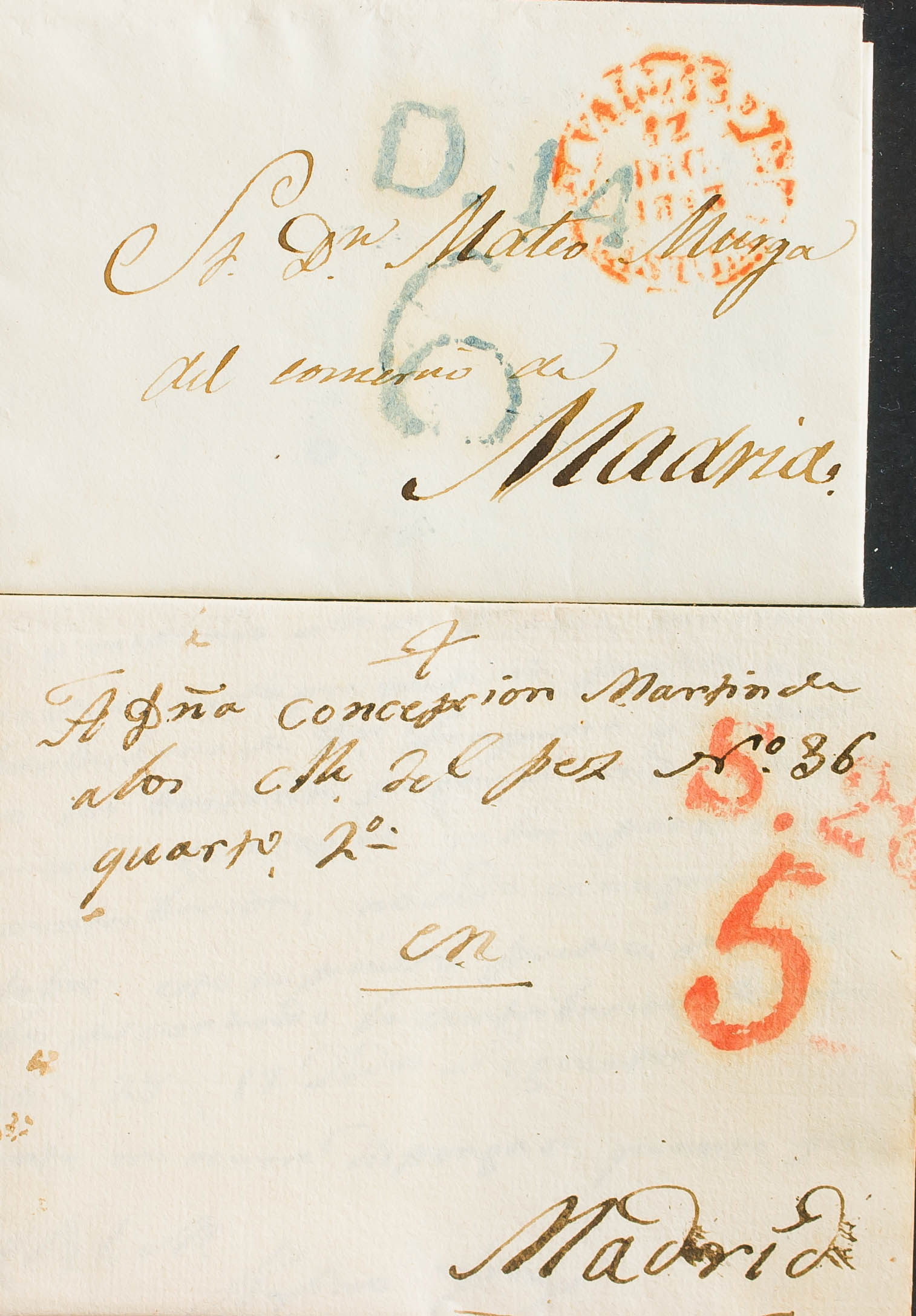1843. Dos cartas dirigidas a MADRID, con fechadores de llegada en el frente, en color rojo y azul respectivamente (P.E.106) edición 2004. MAGNIFICAS.