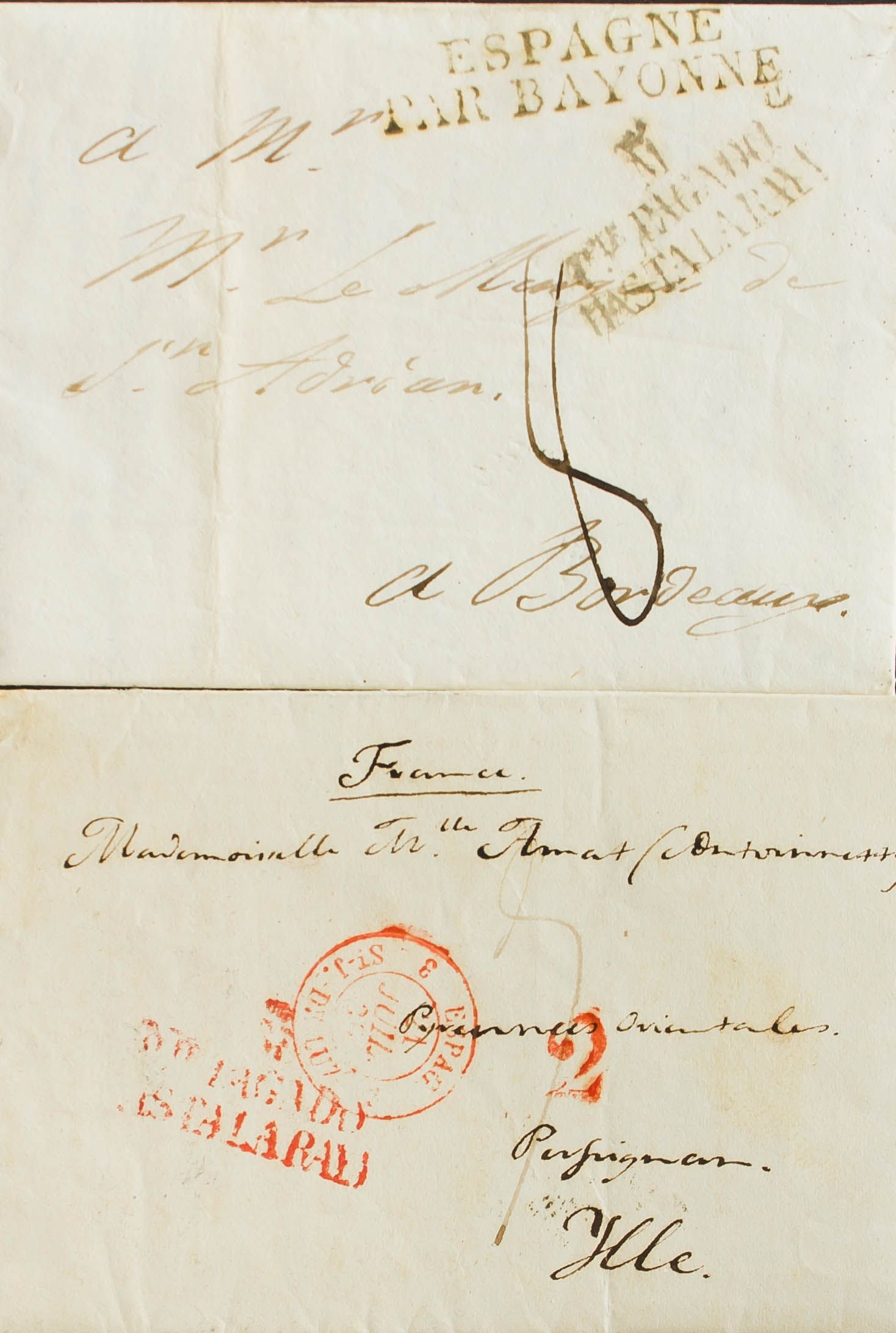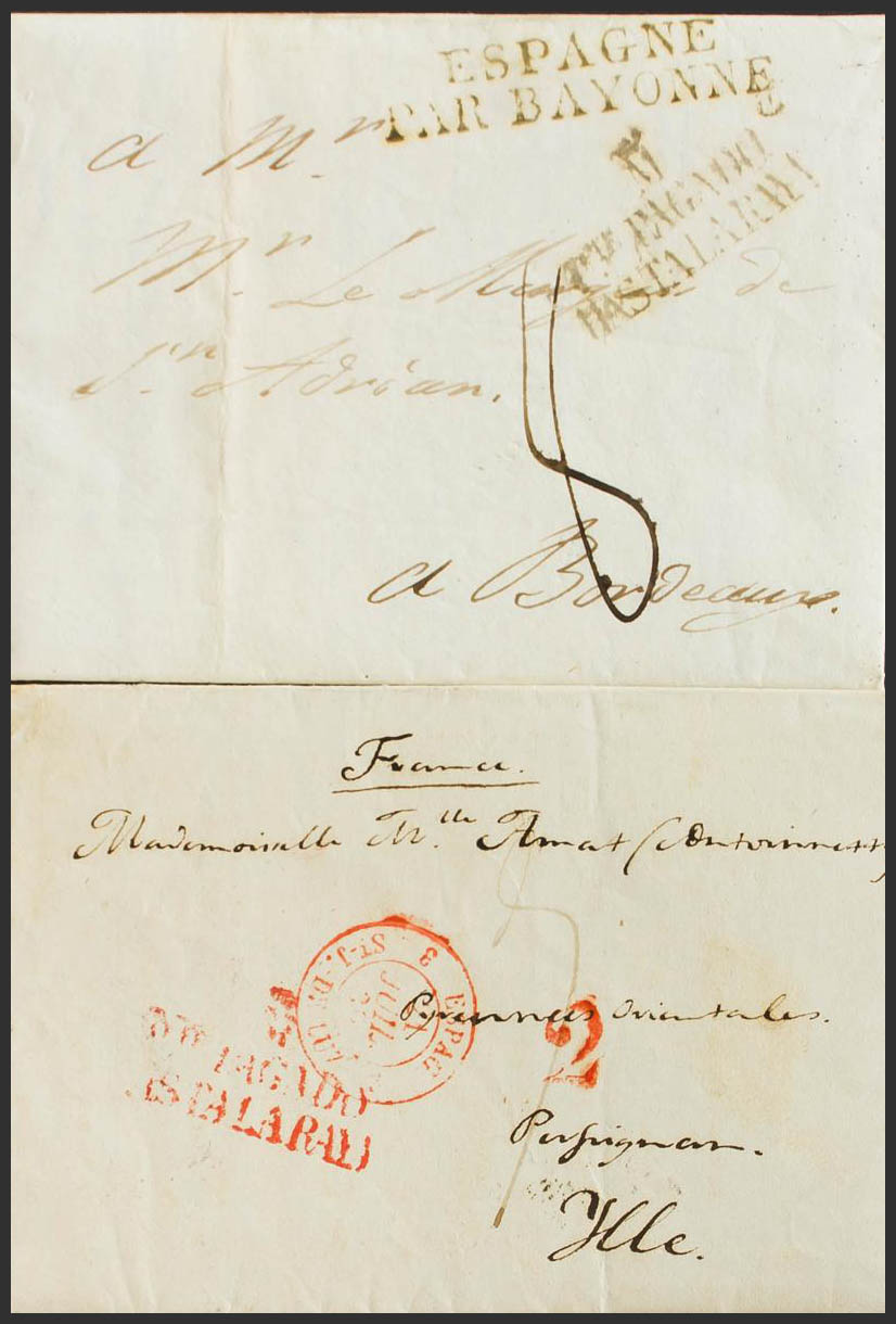 1839. Dos cartas con origen en MADRID y dirigidas a FRANCIA, ambas con la marca M / PTE. PAGADO / HASTA LA RAYA, en negro y rojo respectivamente (P.E.83) edición 2004. MAGNIFICAS.