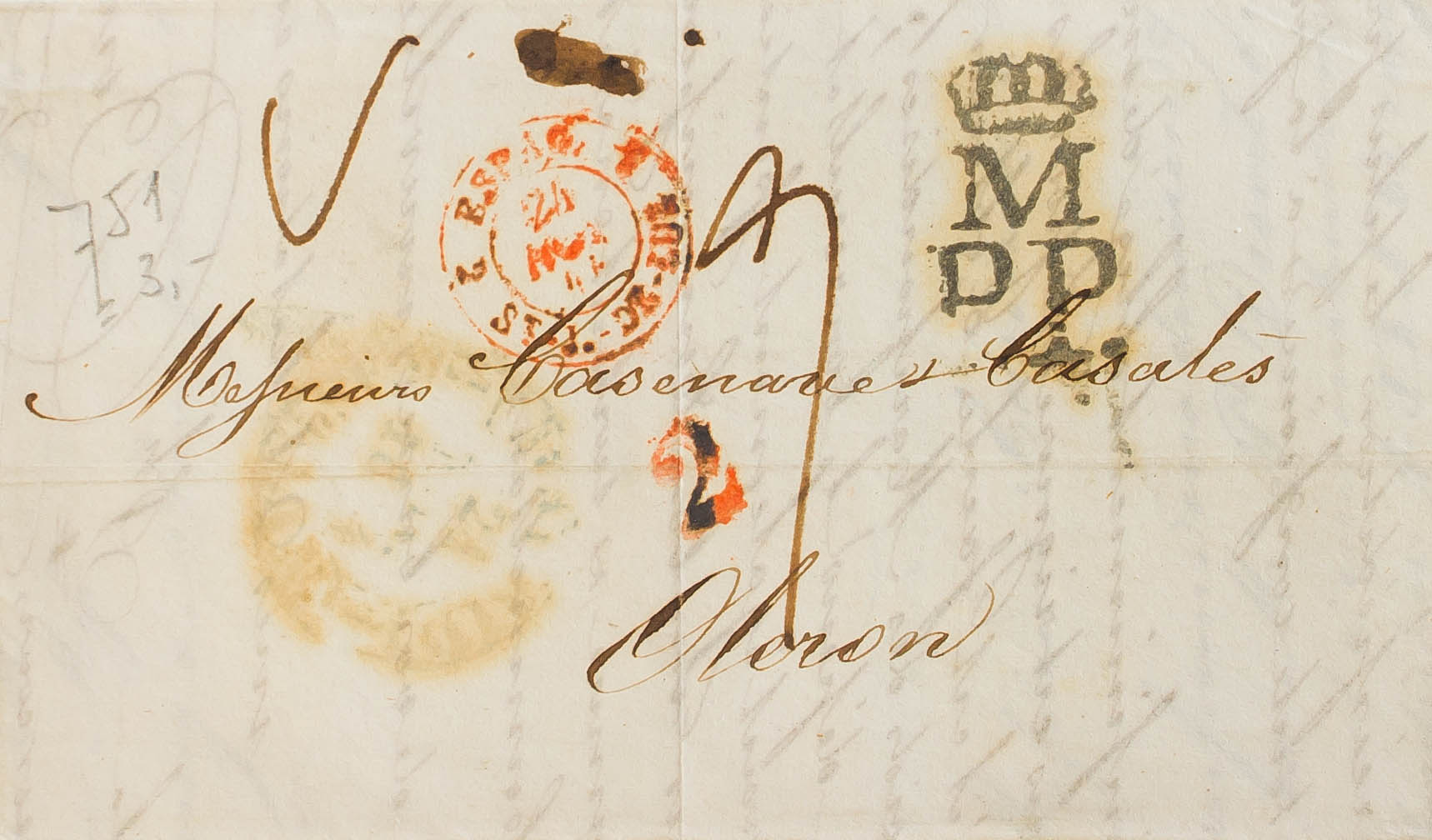 1844. MADRID a OLORON (FRANCIA). Marca M / P.P., en negro de Madrid (P.E.85) edición 2004. MAGNIFICA Y RARO USO MUY TEMPRANO, TIZON INDICA EL INICIO DE ESTA MARCA EN ESTE COLOR EN 1850.