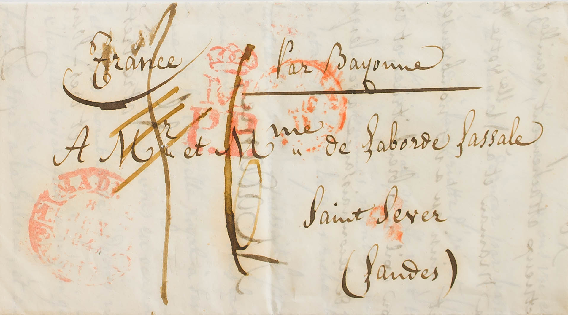 1847. MADRID a SAINT SERVER (FRANCIA). Marca M / P.P., en rojo de Portes Pagados (P.E.85) edición 2004. MAGNIFICA Y ESPECTACULAR.