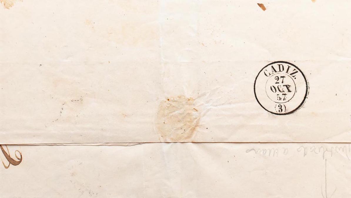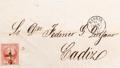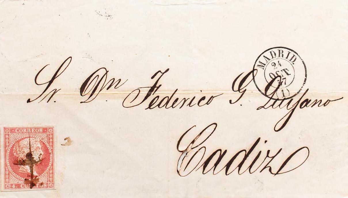 48. 1857. 4 cuartos rojo. MADRID a CADIZ. Inutilizado con trazos de pluma en cruz. MAGNIFICA.