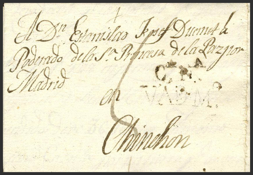 1828. 1828. SESEÑA a CHINCHON. Marca Cª Nª / VALDEMº, en negro. MAGNIFICA Y RARISIMA.