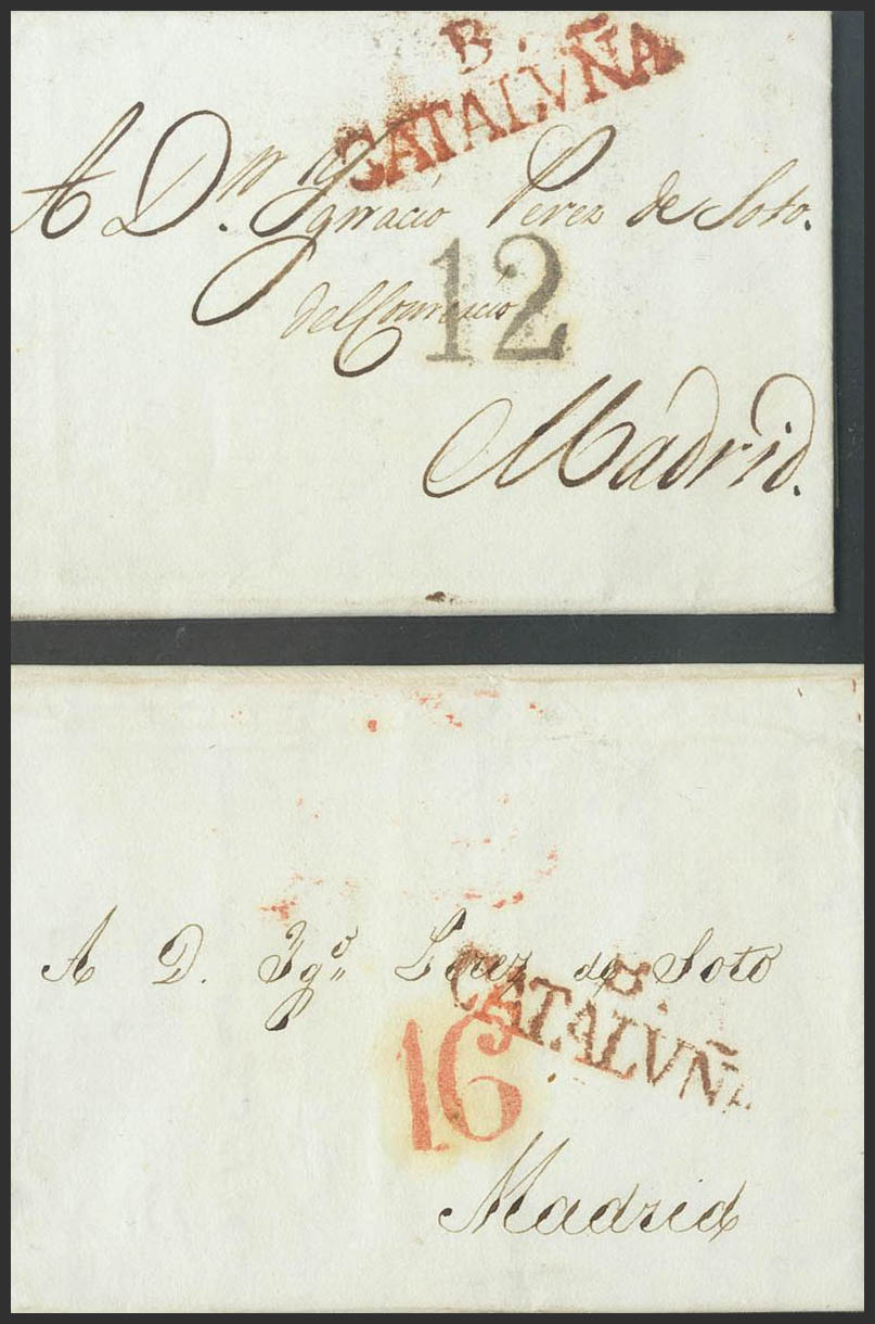 (1822ca). Conjunto de dos cartas prefilatélicas de BARCELONA a MADRID, ambas con la marca B / CATALUÑA, en rojo (P.E.47) edición 2004 y con diferentes fechadores de llegada al dorso (P.E.100) y (P.E.103). MAGNIFICO.