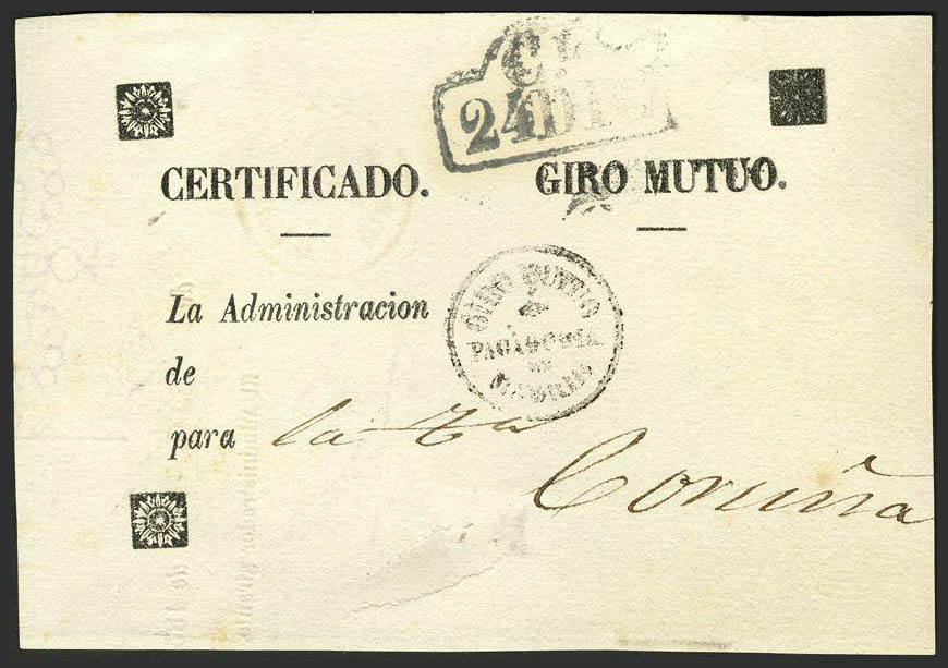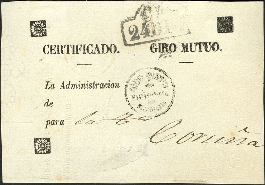 1857. Frontal de GIRO MUTUO de MADRID a CORUÑA. Marca "CL / 24 DIC". Certificado de Madrid. MAGNIFICO Y RARISIMO.