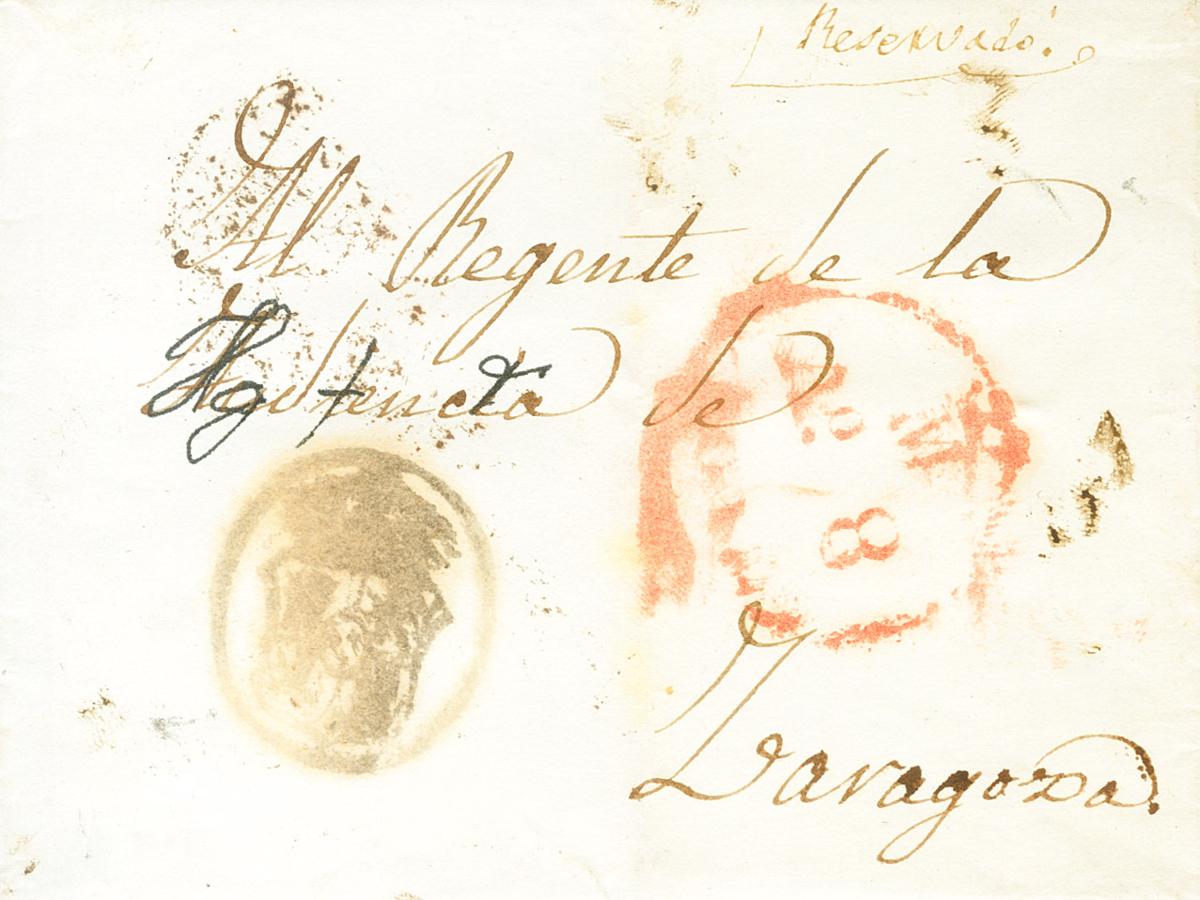 (1844ca). MADRID a ZARAGOZA. Marca de Correo Real (P.E.69) edición 2004, anotación "Reservado" y fechador coronado, en rojo. MAGNIFICA Y MUY RARA.