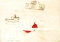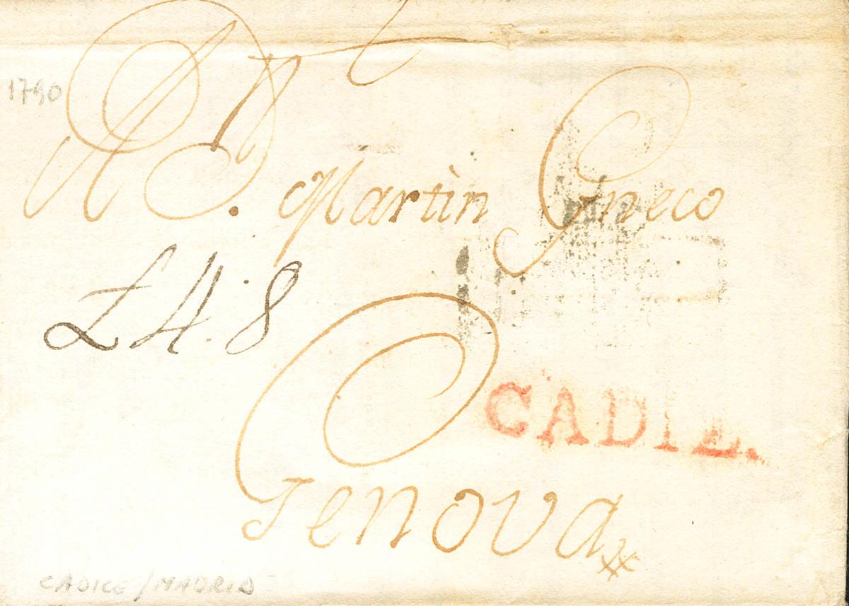 1790. (21 de Mayo). CADIZ a GENOVA (CERDEÑA). Marca CADIZ, en rojo y al dorso marca MADRID.1., aplicada dos veces al dorso en tránsito (P.E.13) edición 2004. MAGNIFICA.
