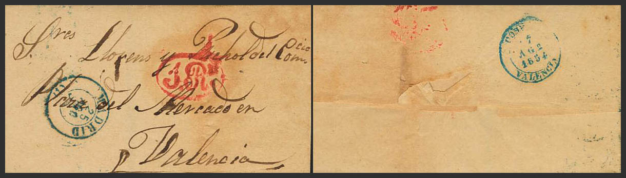 1854. MADRID a VALENCIA. Al dorso fechador especial CORREOS / VALENCIA, en azul, de llegada (P.E.42) edición 2004. MAGNIFICA.