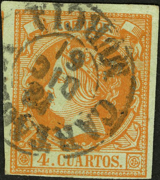 52. 1860. 4 cuartos amarillo. Matasello CARTAGENA / MURCIA (Tipo I). MAGNIFICO.
