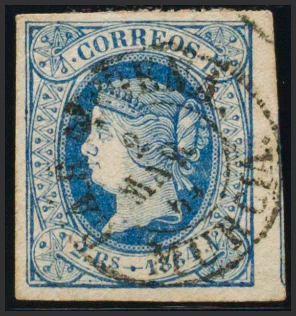68. 1864. 2 reales azul. Matasello CARTAGENA / MURCIA. MAGNIFICO.