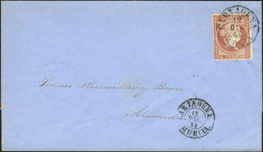 48. 1856. 4 cuartos rojo. CARTAGENA a MADRID. Matasllo CARTAGENA / MURCIA (Tipo I). MAGNIFICA.