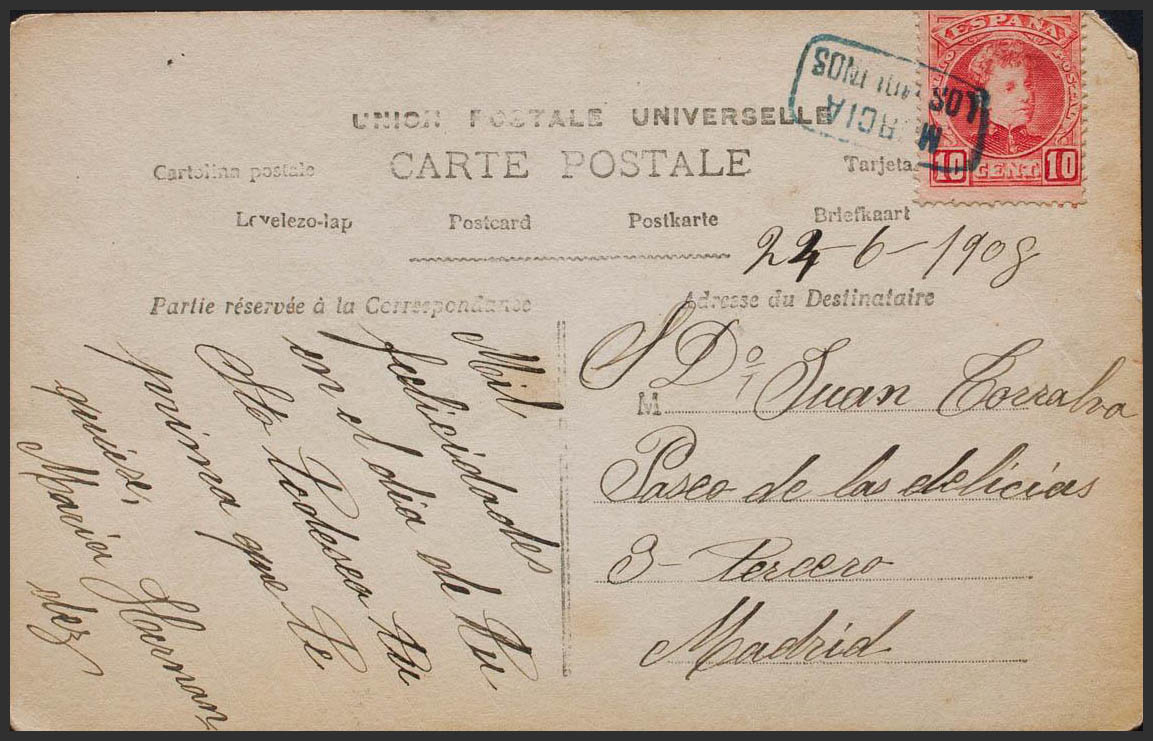 243. 1908. 10 cts rojo. Tarjeta Postal (una esquina con defecto) de LOS MOLINOS a MADRID. Matasello carterÃa MURCIA / LOS MOLINOS, en azul. MAGNIFICA.