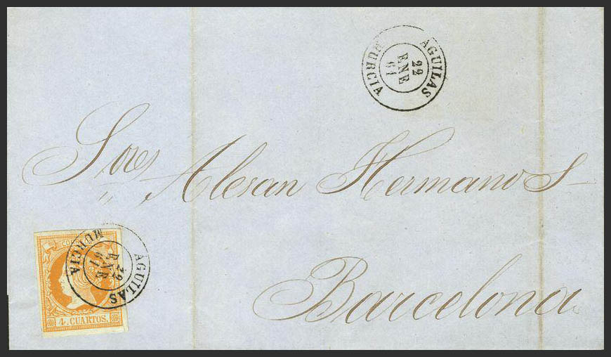 52. 1861. 4 cuartos amarillo. AGUILAS a BARCELONA. Matasello AGUILAS / MURCIA. MAGNIFICA.