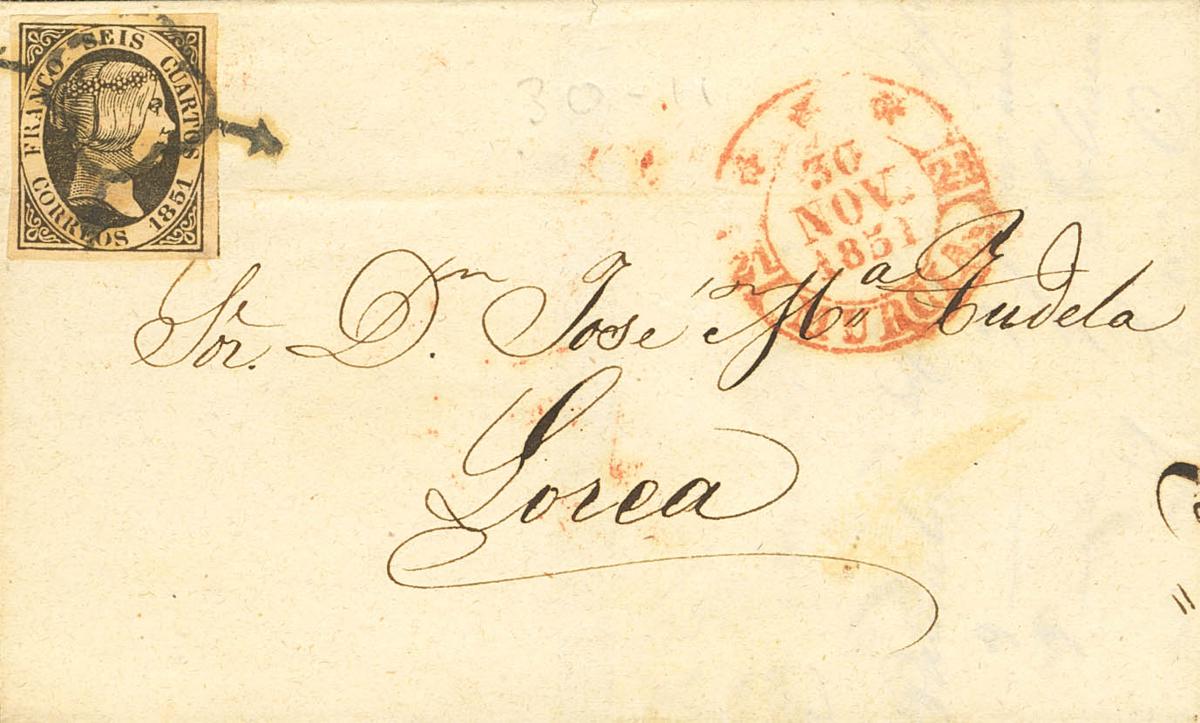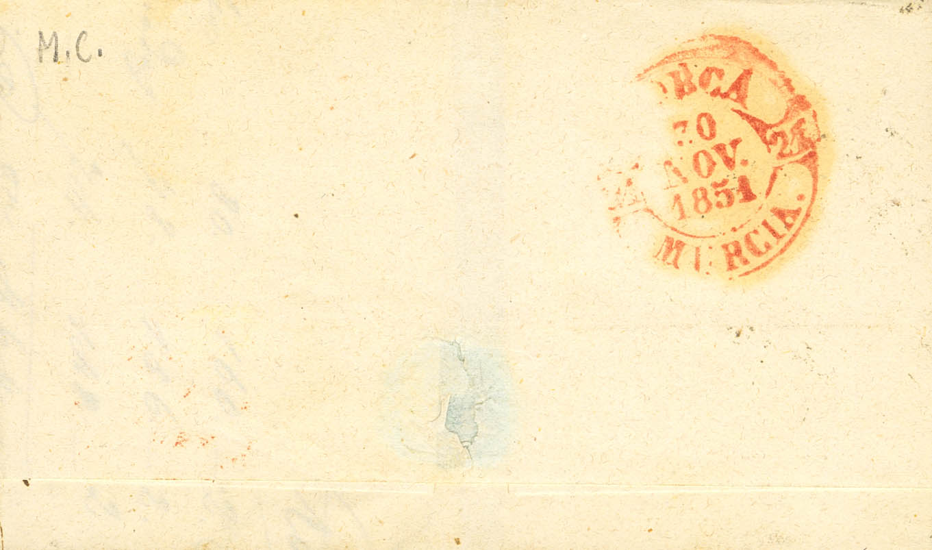 6. 1851. 6 cuartos negro. MURCIA a LORCA. En el frente baeza *** / MURCIA, en rojo. MAGNIFICA.