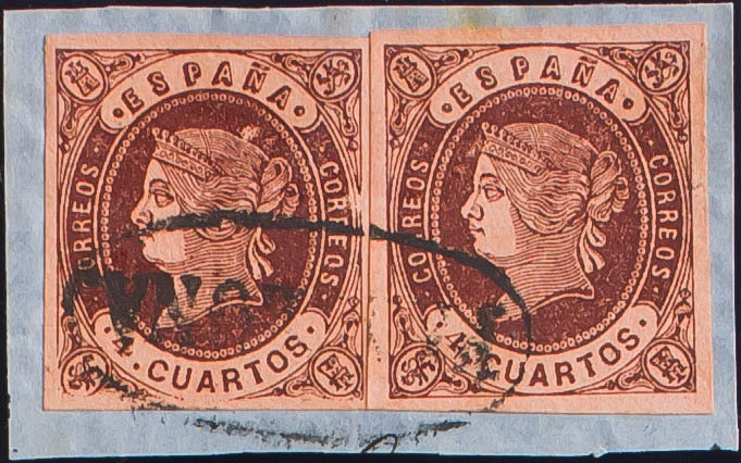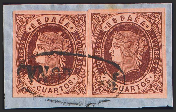 △ 58(2). 1862. 4 cuartos castaño, pareja sobre fragmento. Matasello prefilatélico PAMPLONA. MAGNIFICO Y MUY RARO EN ESTA EXCEPCIONAL CALIDAD.