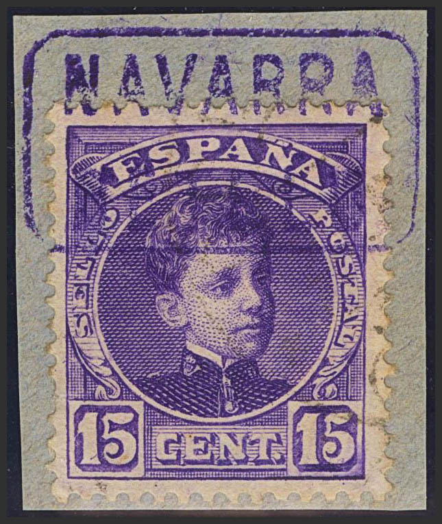 △ 246. 1901. 15 cts violeta, sobre fragmento. Matasello carterÃa NAVARRA / BETELU, en violeta. MAGNIFICA.