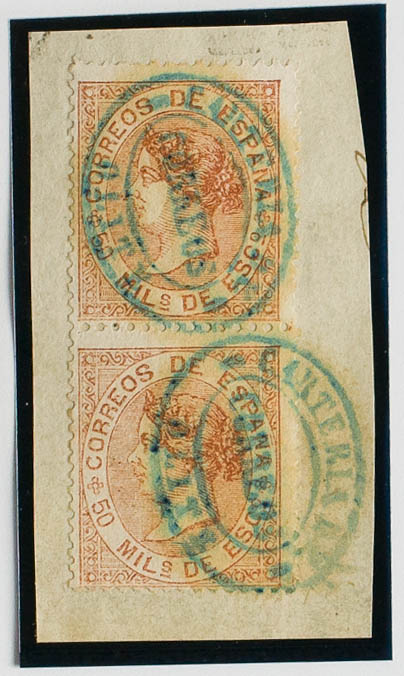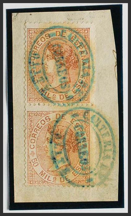 △ 96(2). 1867. 50 mils castaño claro, dos sellos, sobre fragmento. Matasello CARTERIA DE / OLITE, en azul. MAGNIFICA Y RARISIMA.