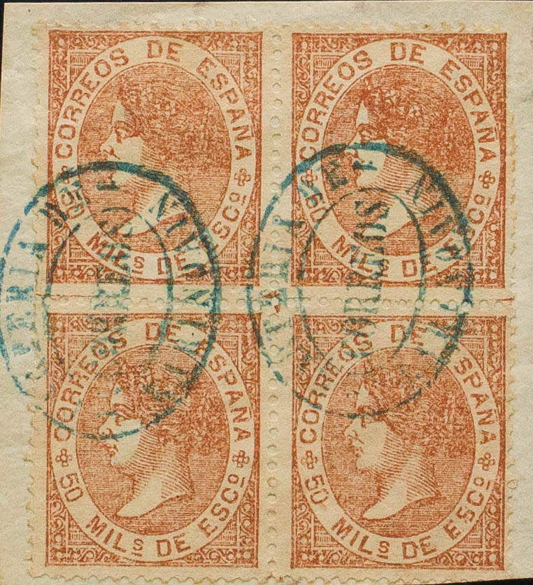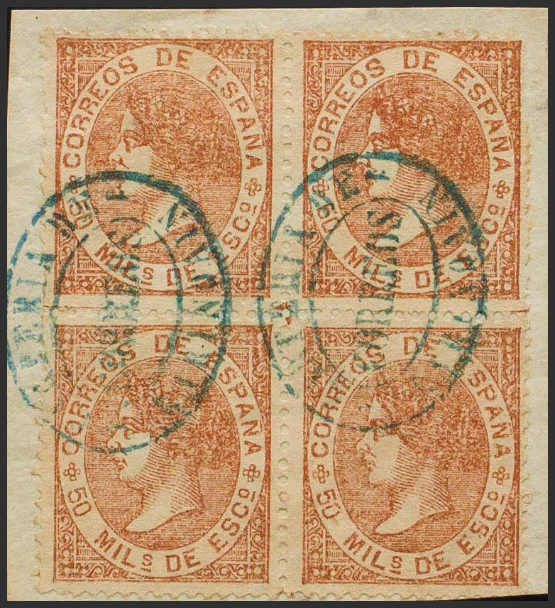 96(4). 1867. 50 mils castaño amarillo, bloque de cuatro sobre fragmento. Matasello CARTERIA DE / GARINOAIN, en azul de Navarra. MAGNIFICO Y RARISIMO.