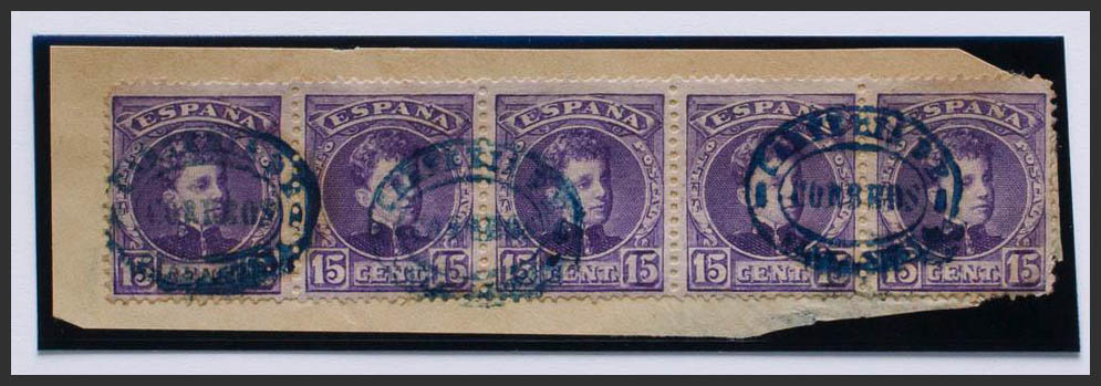 △ 246(5). 1901. 15 cts violeta, tira de cinco sobre fragmento. Matasello CARTERIA DE / VILLAFRANCA, en azul. MAGNIFICA Y RARA.