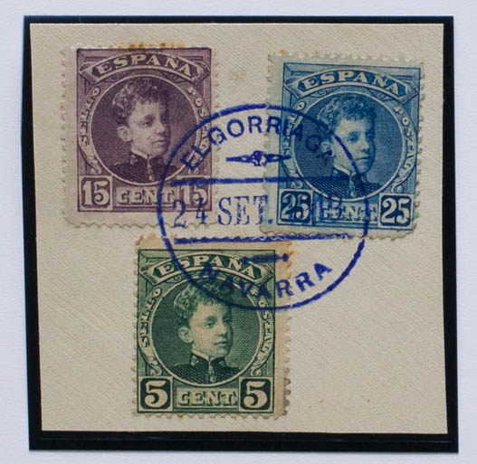 △ 242, 245, 248. 1901. 5 cts verde, 15 cts lila castaño y 25 cts azul, sobre fragmento. Matasello especial "fechador pequeño" ELGORRIAGA / NAVARRA, en violeta. MAGNIFICO Y RARO.