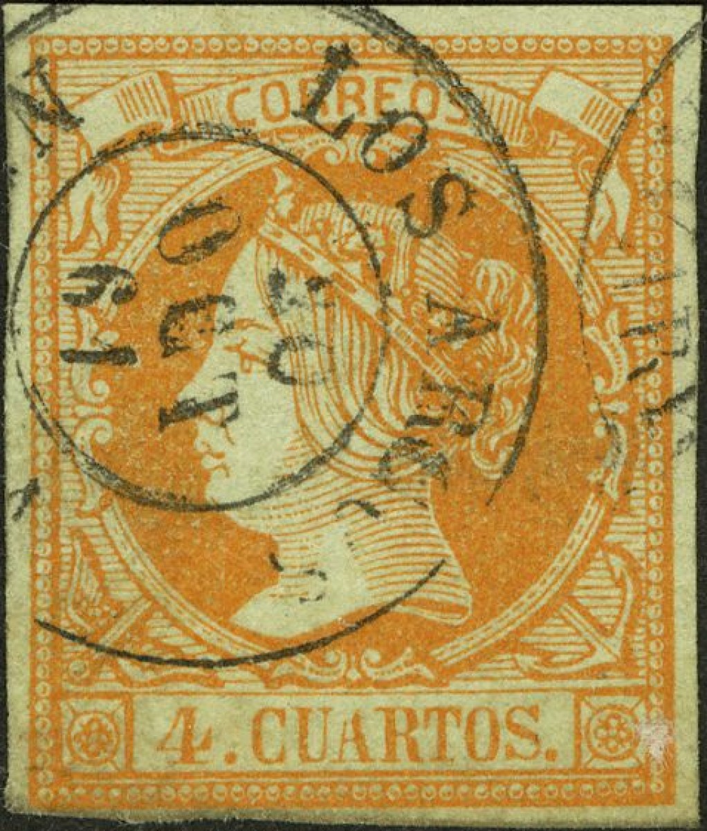 52. 1860. 4 cuartos amarillo. Matasello LOS ARCOS / NAVARRA.