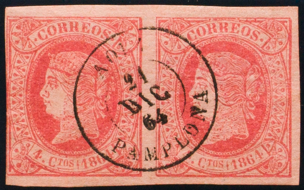 64(2). 1864. 4 cuartos rojo, pareja. Matasello AOIZ / PAMPLONA. MAGNIFICA.