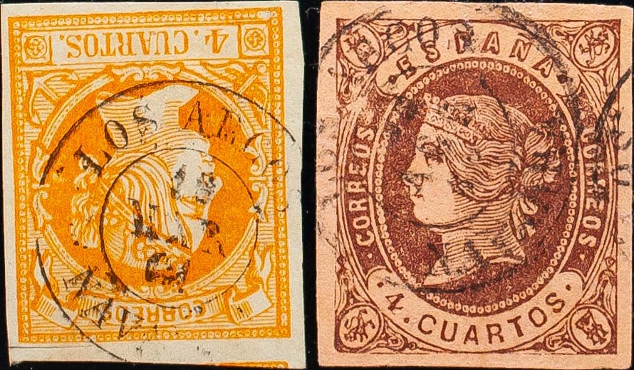52, 58. (1860ca). Conjunto de dos sellos del 4 cuartos amarillo y 4 cuartos castaño, inutilizados con matasello LOS ARCOS / NAVARRA. MAGNIFICO.