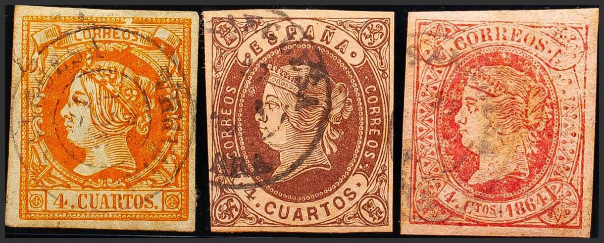 52, 58, 64. (1860ca). Conjunto de tres sellos del 4 cuartos amarillo, castaño y rosa, inutilizados con el matasello SANGUESA / NAVARRA. MAGNIFICO.