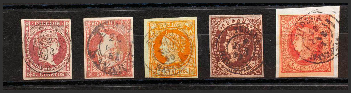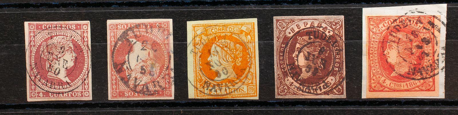 48(2), 52, 58, 64. (1855ca). Conjunto de cinco sellos del 4 cuartos rojo, amarillo, castaño y rosa, inutilizados con el matasello TUDELA / NAVARRA (incluyendo el Tipo I sobre el 4 cuartos rojo). MAGNIFICO.
