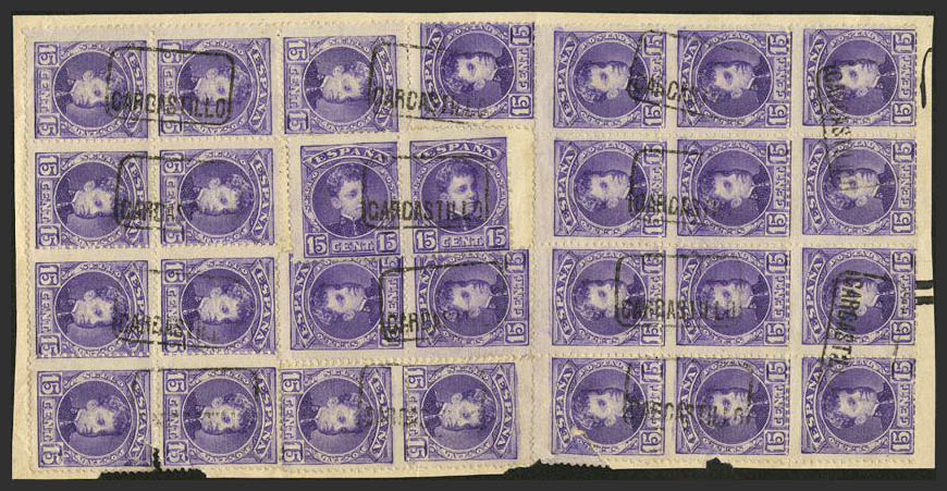 △ 246(28). 1901. 15 cts violeta, veintiocho sellos sobre fragmento. Matasello carterÃa NAVARRA / CARCASTILLO. MAGNIFICO Y RARO BLOQUE.