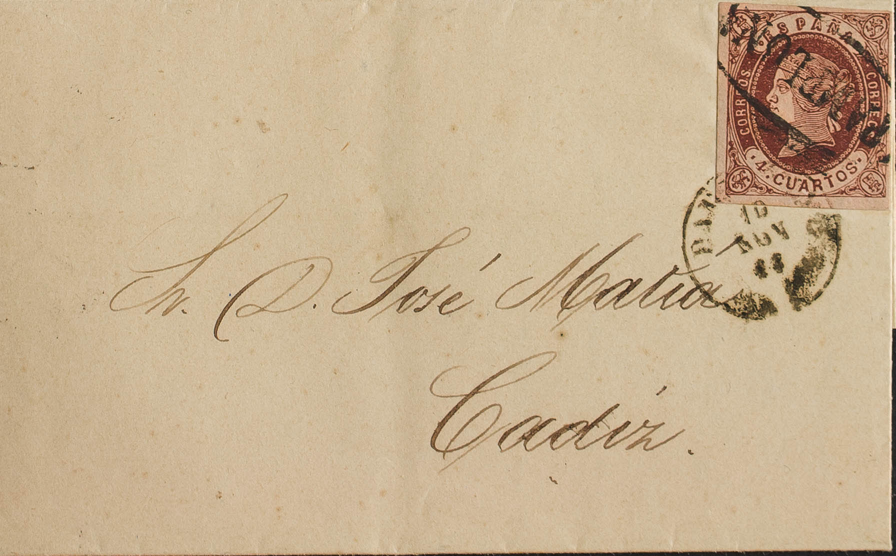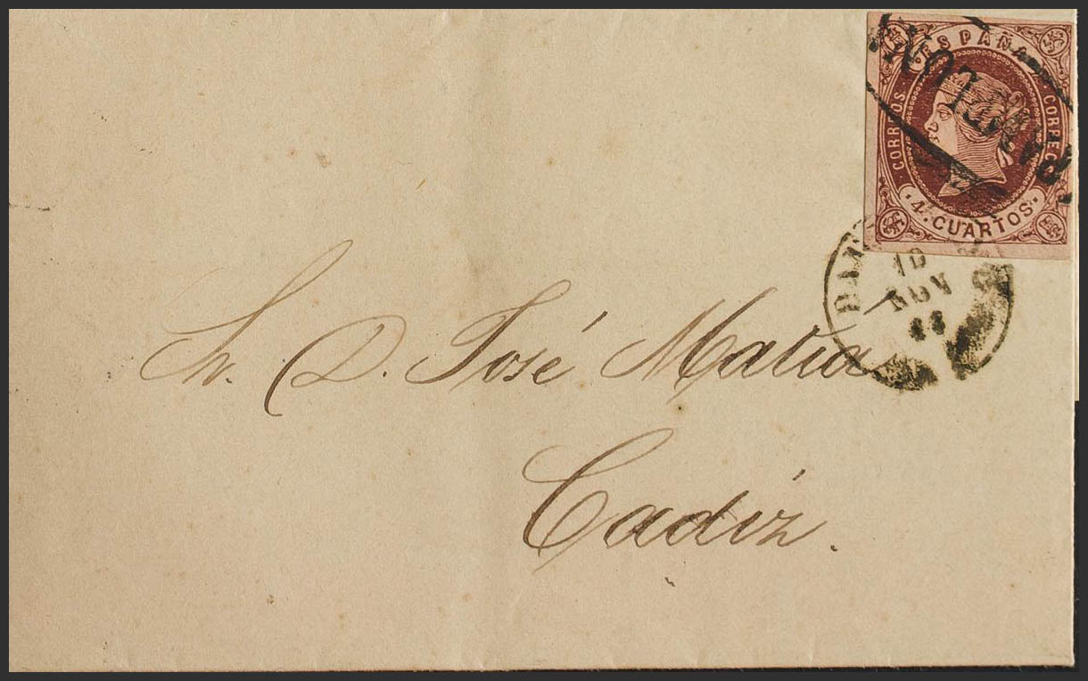 58. 1863. 4 cuartos castaño. PAMPLONA a CADIZ. Matasello prefilatélico PAMPLONA. MAGNIFICA Y RARA.