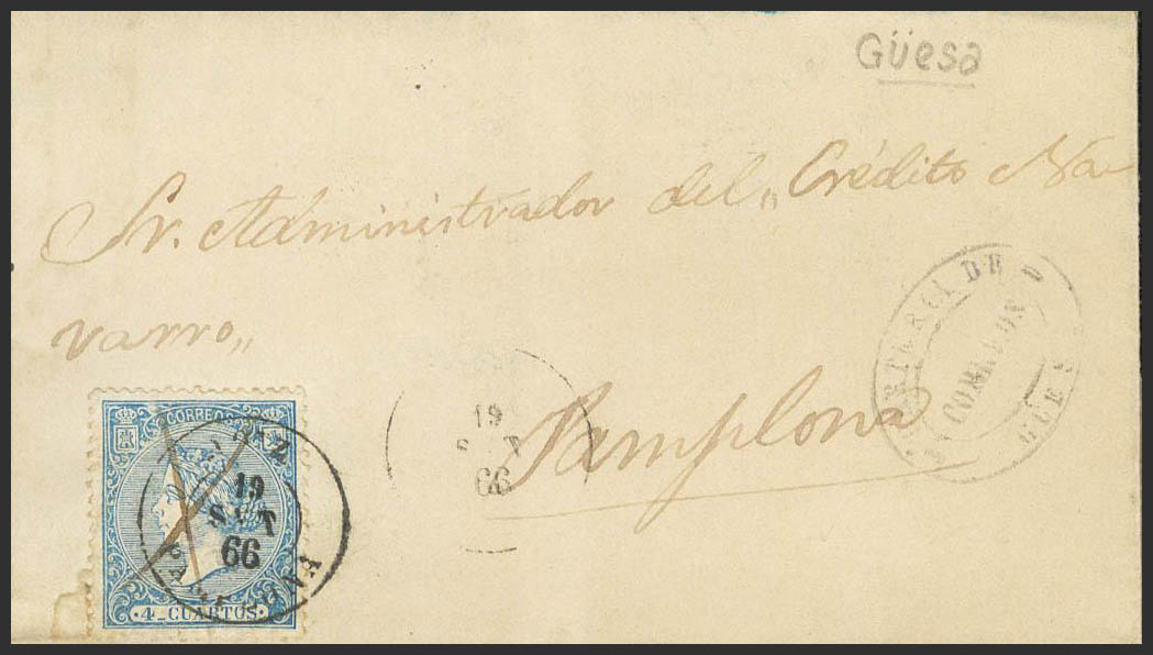 81. 1866. 4 cuartos azul. RONCAL (NAVARRA) a PAMPLONA. Matasello AOIZ / PAMPLONA y trazos de tinta, en el frente marca especial oval CARTERIA DE / GÜESA. MAGNIFICA Y RARISIMA.