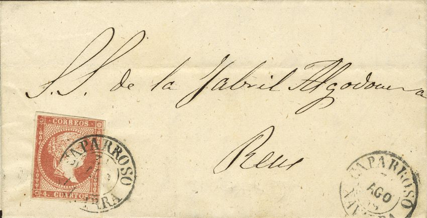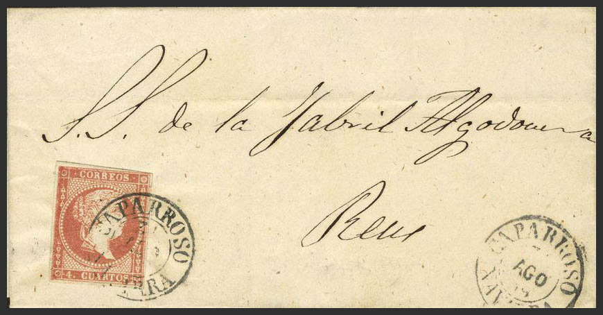 48. 1856. 4 cuartos rojo. CAPARROSO a REUS. Matasello CAPARROSO / NAVARRA. (Tipo I). BONITO.