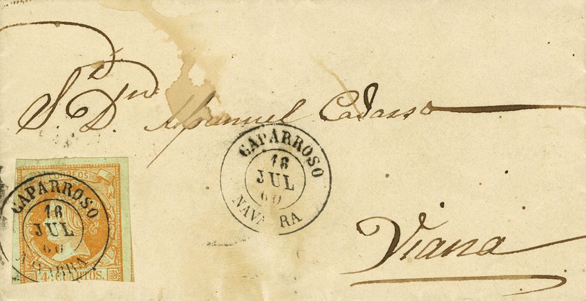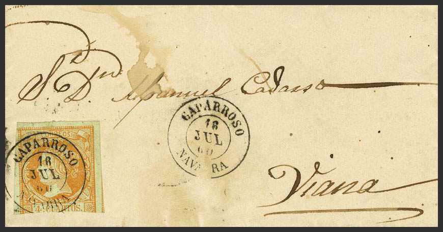 52. 1860. 4 cuartos amarillo. CAPARROSO a VIANA. Matasello CAPARROSO / NAVARRA. MAGNIFICA.