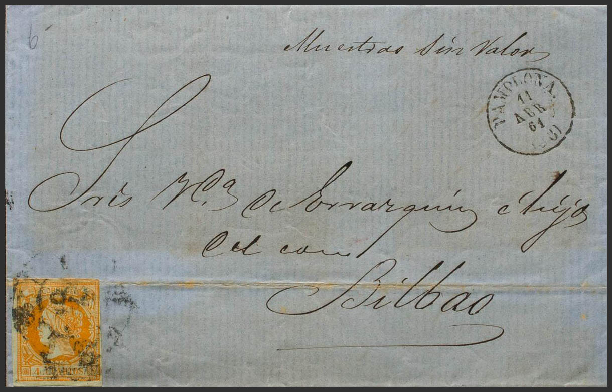 52. 1861. 4 cuartos naranja. PAMPLONA a BILBAO. Matasello R.CARRETA Nº38 y en el frente manuscrito "Muestras sin valor". BONITA.