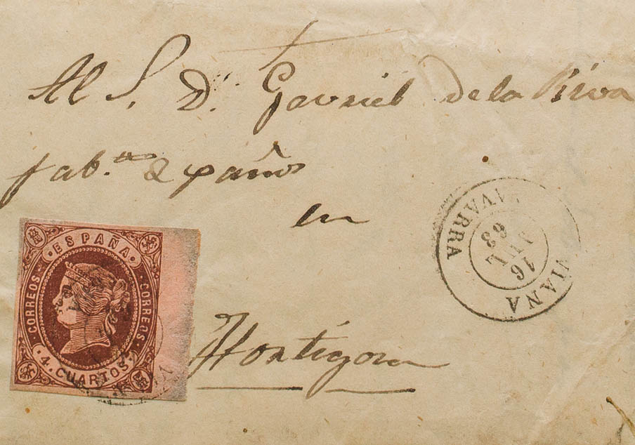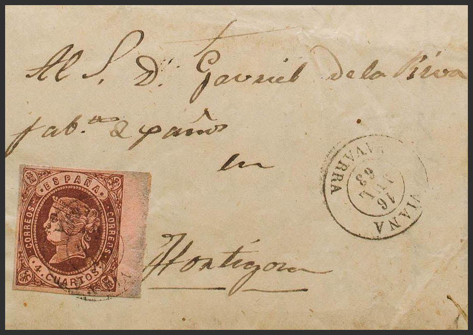 58. 1863. 4 cuartos castaño, borde de hoja. MARAÑON (NAVARRA) a ORTIGOSA. Matasello VIANA / NAVARRA. MAGNIFICA Y MUY RARA.