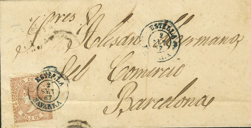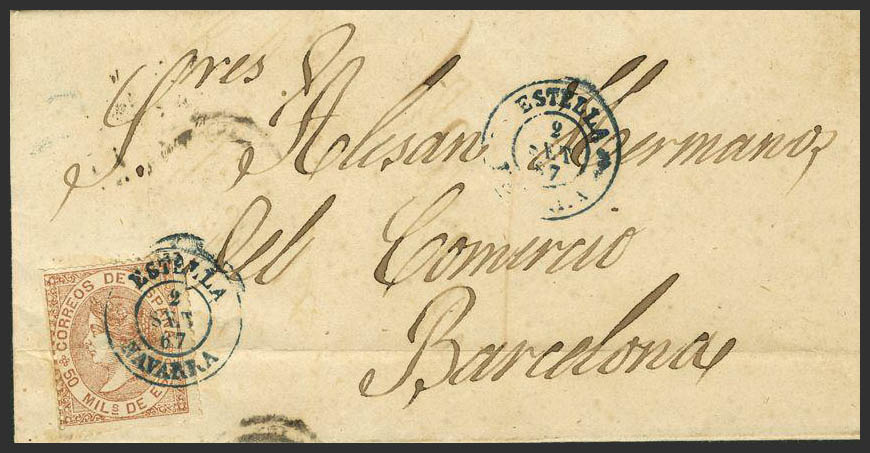96. 1867. 50 mil castaño. ESTELLA a BARCELONA. Matasello ESTELLA / NAVARRA, en azul. MAGNIFICA.