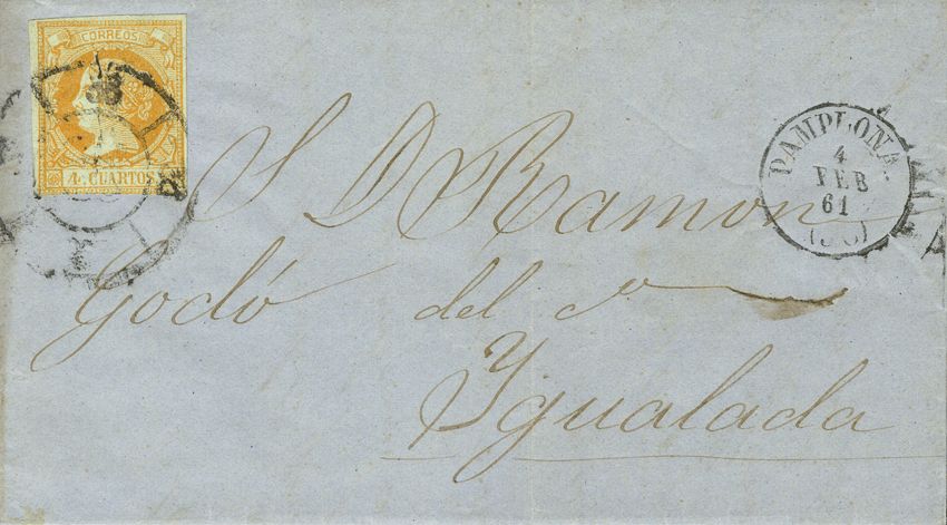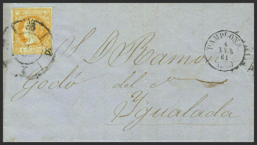 52. 1861. 4 cuartos amarillo. PAMPLONA a YGUALADA. Matasello R. CARRETA Nº 38.