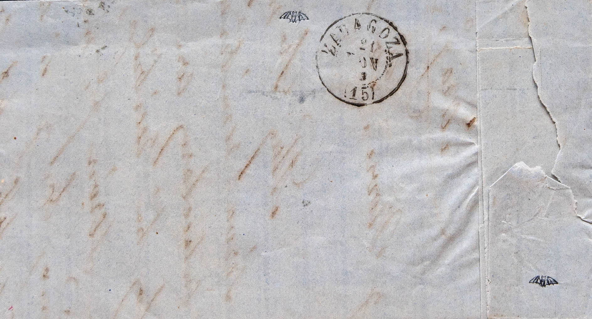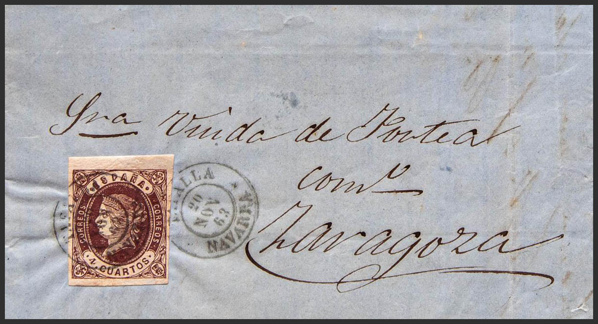 58. 1863. 4 cuartos castaño. TAFALLA a ZARAGOZA. Matasello TAFALLA / NAVARRA. MAGNIFICA.