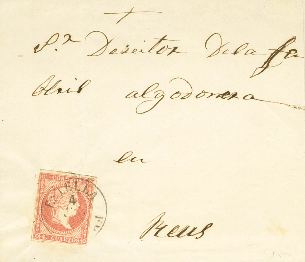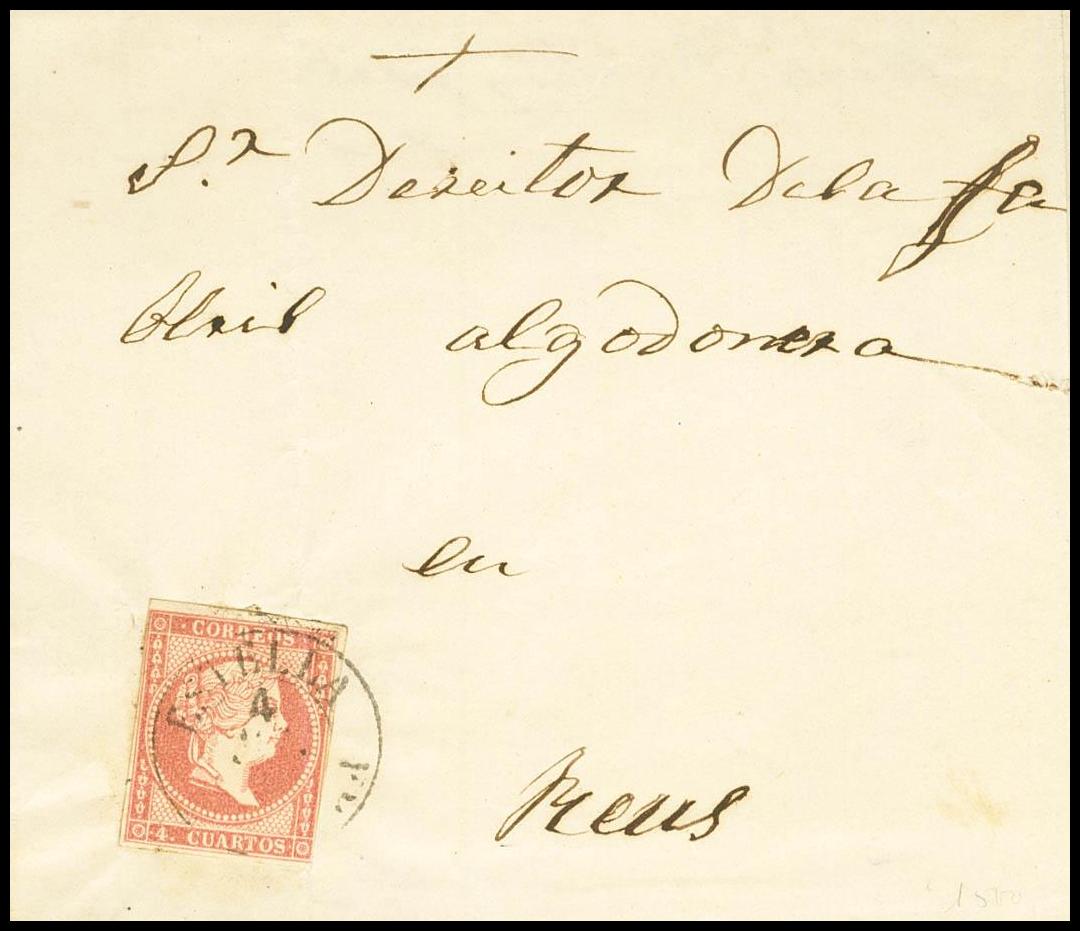 48. 1858. 4 cuartos rojo. ESTELLA a REUS. Matasello ESTELLA / NAVARRA (Tipo I). MAGNIFICA.