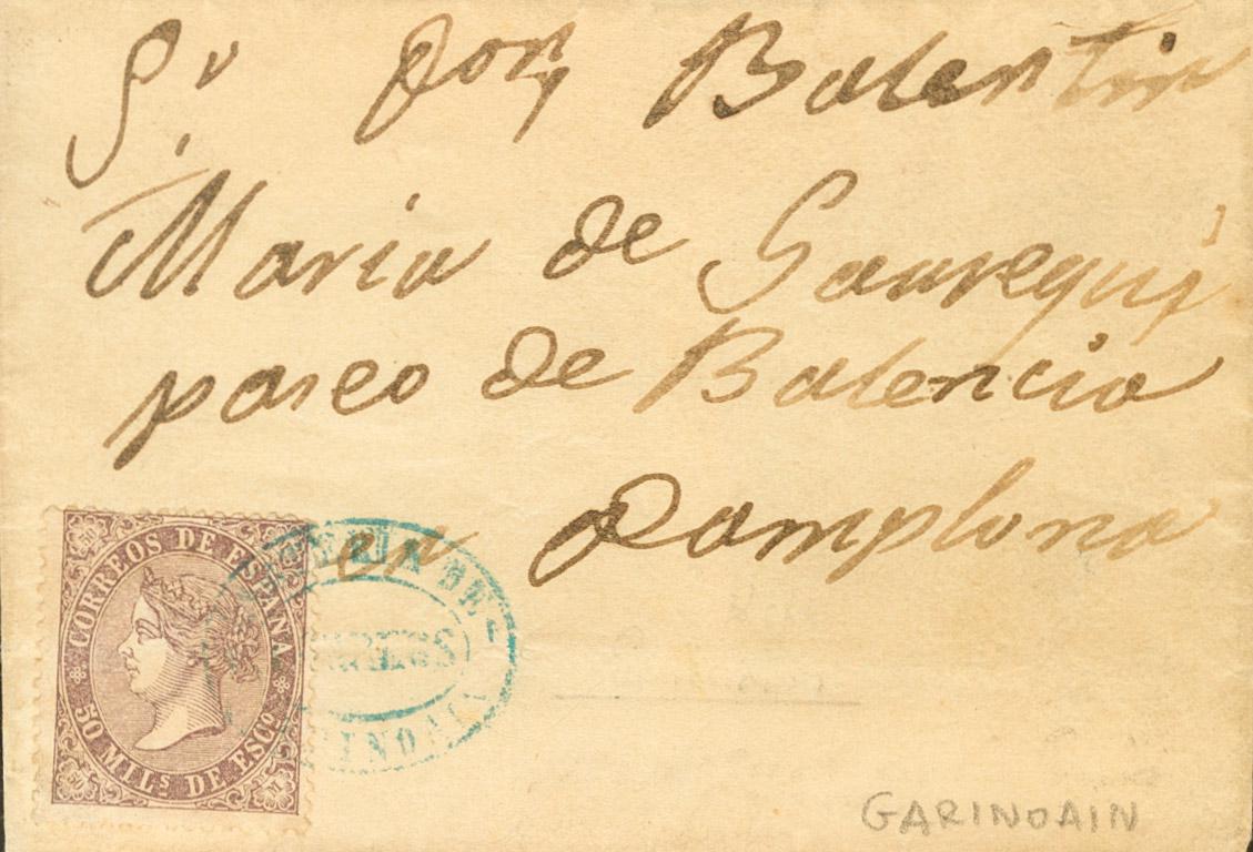 98. 1869. 50 mils violeta. GARINOAIN (NAVARRA) a PAMPLONA. Matasello CARTERIA DE / CORREOS / GARINOAIN, en azul. MAGNIFICA Y RARISIMA.