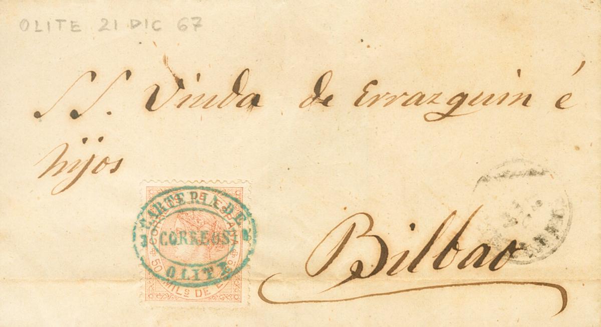 96. 1867. 50 mils castaño amarillo. OLITE (NAVARRA) a BILBAO. Matasello CARTERIA DE / CORREOS / OLITE, en azul. MAGNIFICA Y ESPECTACULAR ESTAMPACION.