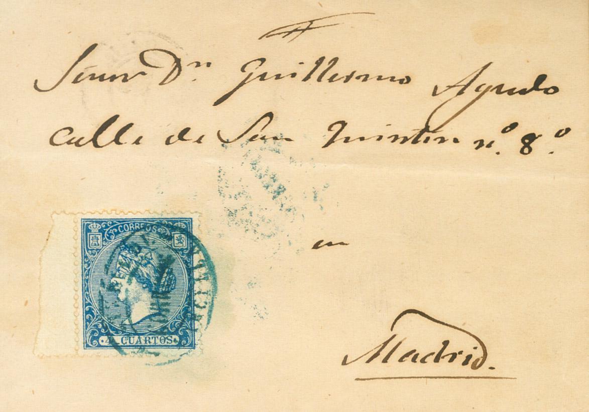81. 1866. 4 cuartos azul, borde de hoja. MARCILLA (NAVARRA) a MADRID. Matasello CARTERIA DE / CORREOS / MARCILLA, en azul. MAGNIFICA Y MUY RARA.