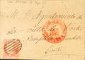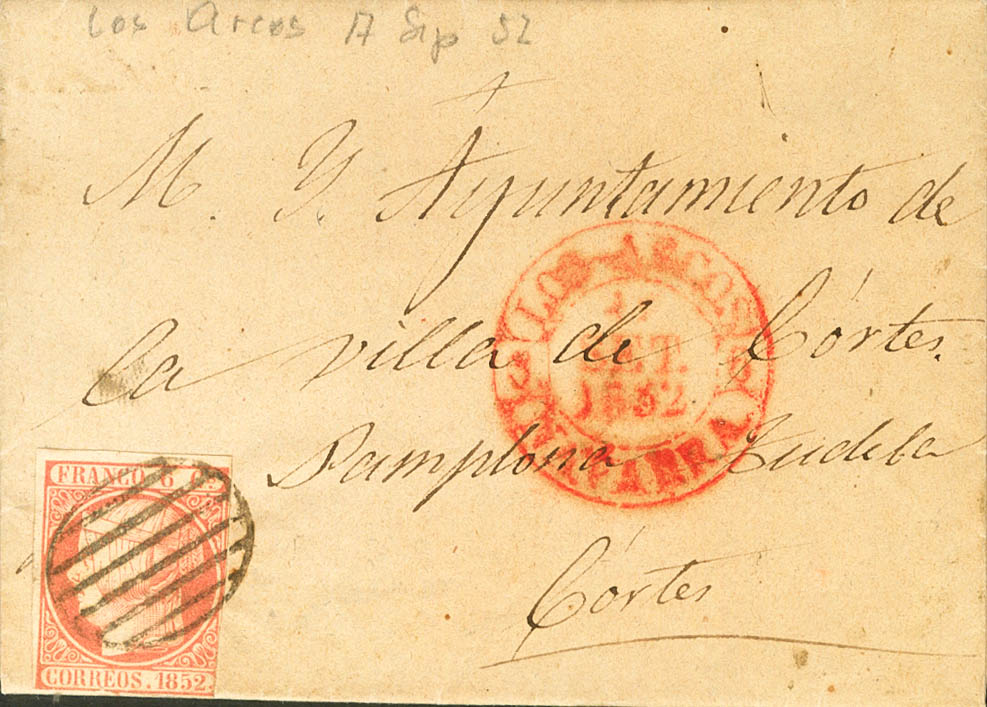 12. 1852. 6 cuartos rosa. LOS ARCOS a CORTES. En el frente baeza LOS ARCOS / NAVARRA, en rojo. MAGNIFICA.